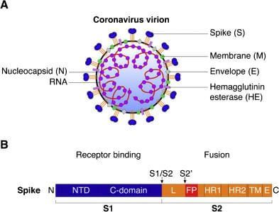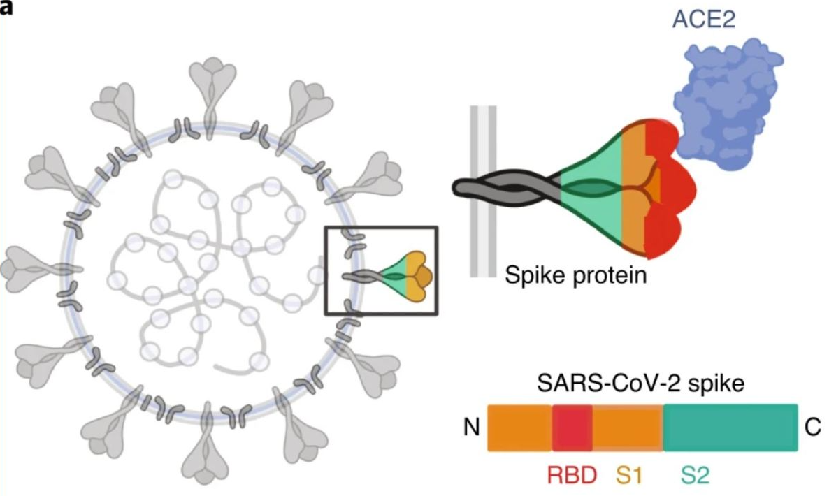 L'RNA del SARS-Cov-2 codifica per quattro proteine strutturali, incluse le proteine spike (S), di membrana (M), envelope (E) e nucleocapside (N), con la proteina S composta da due sub-unità S1 e S2. Il dominio legante il recettore(receptor-binding domain, RDB) è incluso nella sub-unità S1 e possiede un'elevata affinità per il recettore dell'enzima di conversione dell'angiotensina 2 (ACE2) sulla superficie della membrana cellulare.